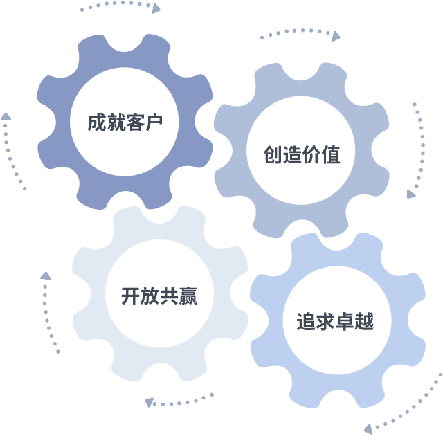 成就客户是一切决策的出发点,,,创造价值是衡量所有工作的标准,,,,追求卓越是我们做事做人的态度,,开放共赢是我们的格局也是最终的结果。。。。价值观的齿轮环环相扣,,,,推动着组织里的每个人不断向前。。。。