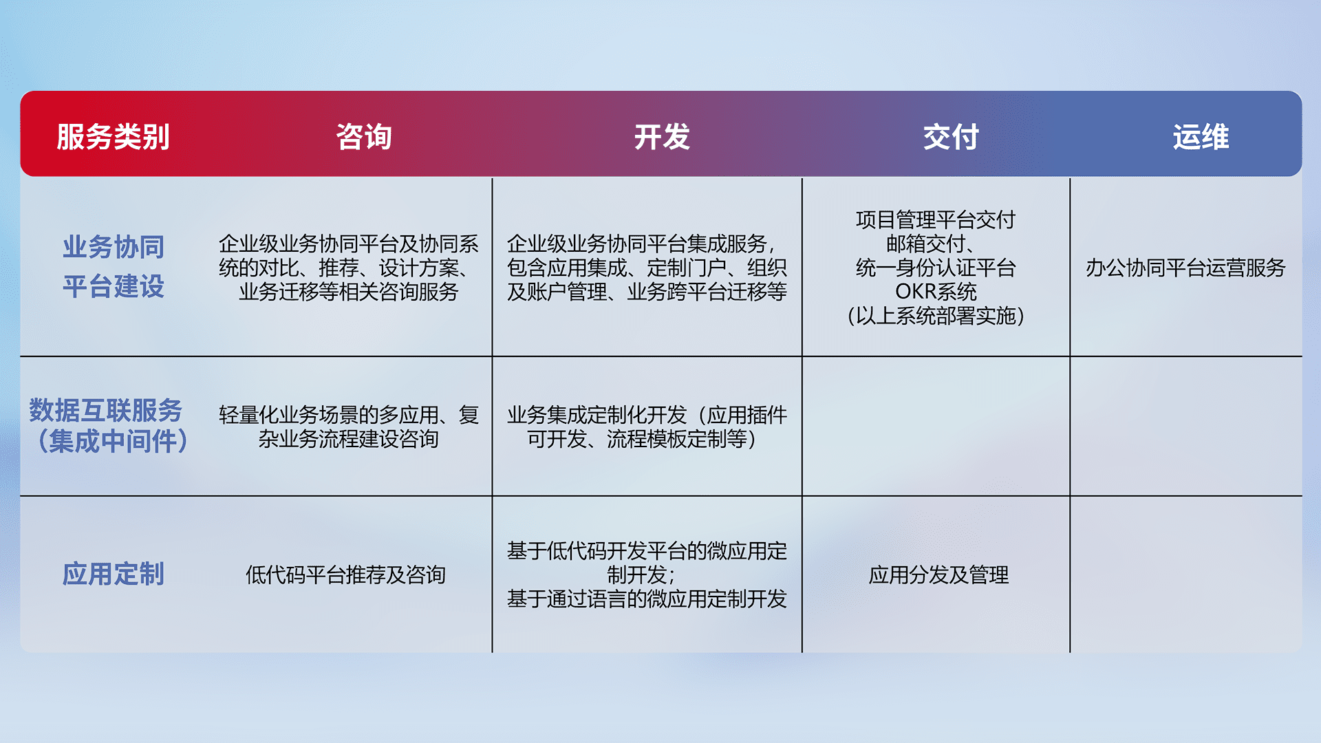 针对钉钉、、、企微、、、、IDaas等平台级产品提供产品的规划、、方案、、交付、、、定制化开发等服务,,,实现如统一协同办公、、、智能客户服务、、混合会议管理、、、智能数据查询、、等业务场景,,,,实现数字化转型。。。