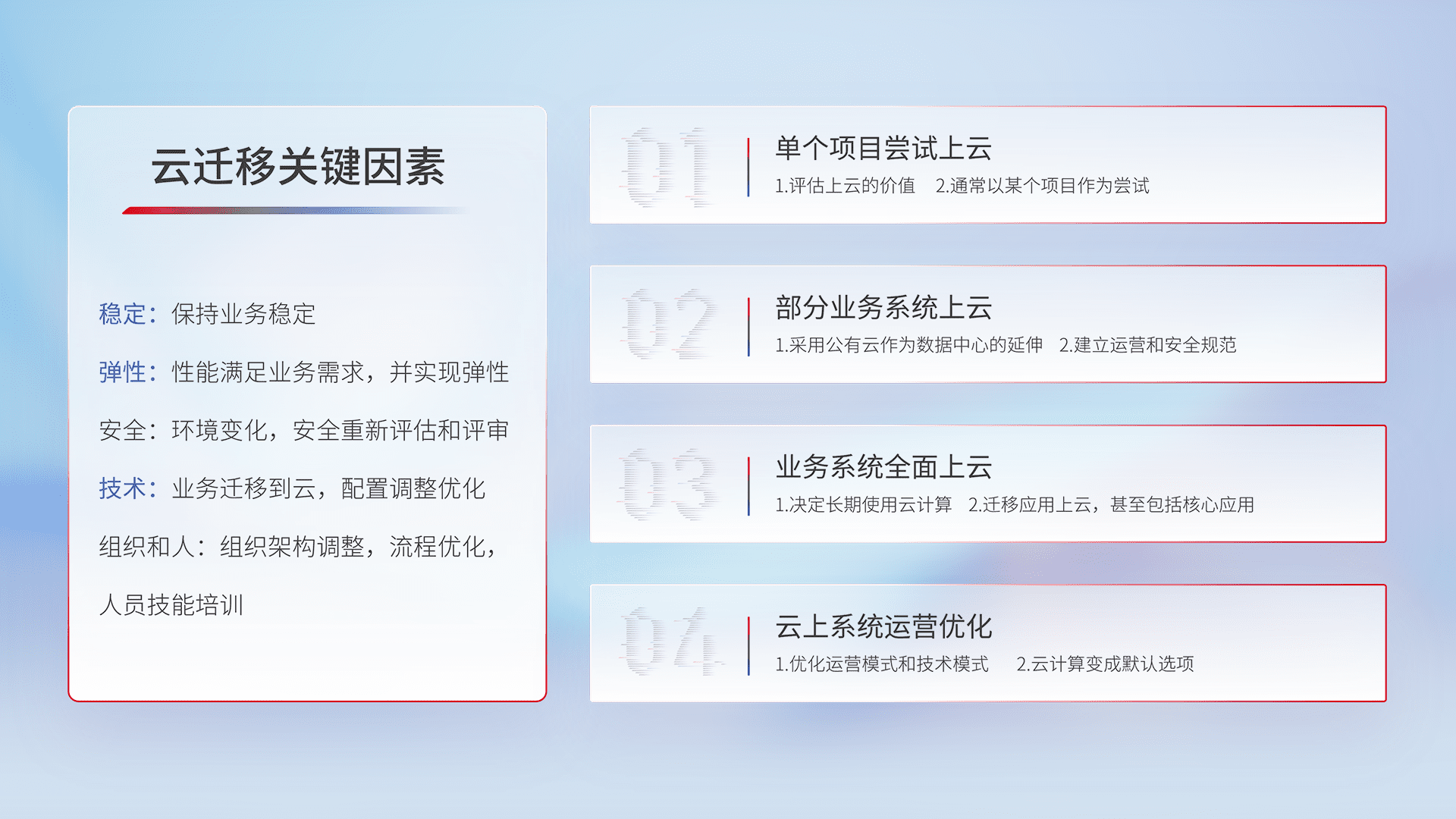 结合实际业务,,,,从规划设计、、、云平台选型、、、云原生改造、、、、数据迁移、、集成交付,,,,迁移全过程为客户识别最佳上云路径,,,,做好风险识别管理,,,设计网络架构、、、、身份权限、、、安全审计合规、、、操作审计、、、、日志审计、、、监控告警策略、、、、多站点容灾设计等,,,,对云上基础设施进行整体规划,,提升IT治理水平,,,以满足弹性、、、高可用、、、高性能的需求。。。