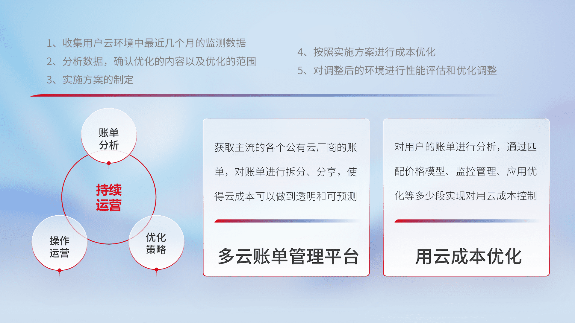通过多云纳管,,以统一的资源数据模型把客户的云资源进行抽象和封装,,,进而实现对多云资源的统一操作,,,保障云资源管理的可靠性、、稳定性与可用性。。量身定制化运维内容,,,,配置、、开发运维、、、补丁管理、、、备份、、监控、、认证和访问管理、、、、审计和日常巡检等,,保障在用云过程中的可靠度,,,,稳定度以及高可用率。。。